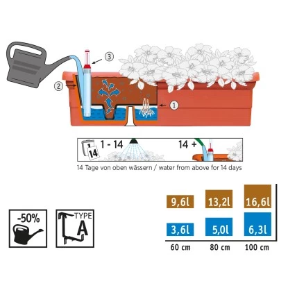 Besonders praktisch ist der integrierte Überlauf, damit Ihre Pflanzen auch bei zuviel Regen nicht „ertrinken“. Das maximale Erd- und Wasservolumen können Sie der zweiten Abbildung entnehmen.