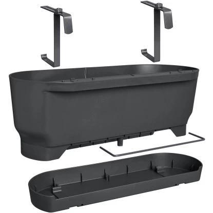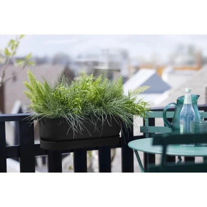 Ob Sie sich für eine einzelne Pflanze entscheiden oder Ihren ganzen Balkon grüner machen möchten: Mit dem Elho Übertopf Greenville Easy Balcony Living Schwarz liegen Sie in jedem Fall richtig. Die Blumentöpfe sind in verschiedenen natürlichen Farben erhältlich und passen mit ihrem klaren Design perfekt auf Ihren Balkon. Dank des integrierten Wasserspeichers können Sie mühelos für Ihre Pflanzen sorgen. Sie können sich darauf verlassen, dass dieser Blumentopf mit Liebe zur Natur gemacht wurde. Er besteht aus recyceltem Kunststoff, wurde produziert mit Windenergie von unserem eigenen Windrad und ist außerdem vollständig recyclebar. Einfach anzubringen: Schieben Sie die Haken auf die Breite Ihres Geländers und Sie sind fertig. Es sind keine Werkzeuge erforderlich.