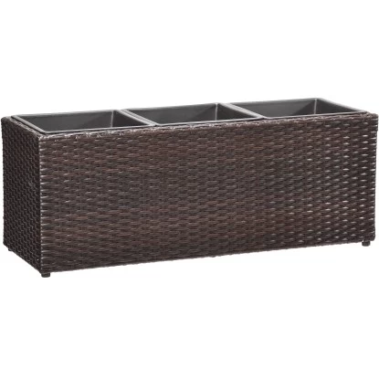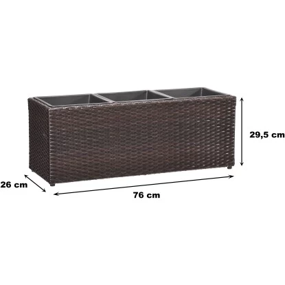 Der Pflanzkübel Polyrattan ist ein Pflanzgefäß für den Innen- und Außenbereich und setzt dekorative Akzente im Haus, auf der Terrasse oder im Garten. Das Pflanzgefäß ist aus einem hochwertigen PE-Kunststoffgeflecht hergestellt, das über einen rostbeständigen Alu-Rahmen gewebt ist. Die Faser ist UV- und temperaturbeständig, langlebig und pflegeleicht. Der Kunststoffeinsatz kann bequem außerhalb des Gefäßes bepflanzt und dann eingesetzt werden und bietet mit einer Größe von 24 cm x 24 cm x 24,5 cm ausreichend Platz. Gegenüber Einsätzen aus anderen Materialien bietet dieser den Vorteil, nicht zu rosten und absolut wasserdicht zu sein. Bei Außenaufstellung einfach ein Loch in den Boden bohren, um Staunässe zu vermeiden.