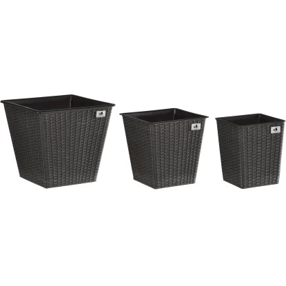 Das Pflanzgefäß Polyrattan 3er-Set ist für den Innen- und Außenbereich geeignet und setzt dekorative Akzente im Haus, auf der Terrasse oder im Garten. Die Pflanzgefäße sind aus einem hochwertigen PE-Kunststoffgeflecht hergestellt, das auf einen wasserdichten Kunststofftopf aufgebracht ist. Die Faser ist UV- und temperaturbeständig, langlebig und pflegeleicht. Bei Außenaufstellung einfach ein Loch in den Boden bohren, um Staunässe zu vermeiden.