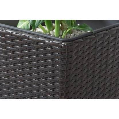 Der Pflanzkübel Polyrattan ist ein Pflanzgefäß für den Innen- und Außenbereich und setzt dekorative Akzente im Haus, auf der Terrasse oder im Garten. Das Pflanzgefäß ist aus einem hochwertigen PE-Kunststoffgeflecht hergestellt, das über einen rostbeständigen Alu-Rahmen gewebt ist. Die Faser ist UV- und temperaturbeständig, langlebig und pflegeleicht. Der Kunststoffeinsatz kann bequem außerhalb des Gefäßes bepflanzt und dann eingesetzt werden und bietet mit einer Größe von 26 cm x 26 cm x 30 cm auch für größere Pflanzen ausreichend Platz. Gegenüber Einsätzen aus anderen Materialien bietet dieser den Vorteil, nicht zu rosten und absolut wasserdicht zu sein. Bei Außenaufstellung einfach ein Loch in den Boden bohren, um Staunässe zu vermeiden.