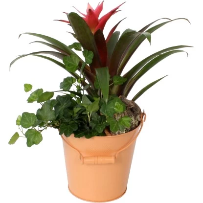 Eine leuchtend rote Guzmanie (Guzmania) ist hier zusammen mit einem Efeu (Hedera) in einem originellen, orangen Zinkeimer arrangiert. Die Guzmanie (Guzmania) ist in Südamerika beheimatet und braucht daher viel Licht. Vor direkter Sonne muss sie jedoch geschützt werden. Wärme und eine hohe Luftfeuchtigkeit sind ein Muss. Die Guzmania brauch viel Feuchtigkeit. In den Trichtern sollte immer Wasser stehen, außer im Winter. Dazu häufig besprühen und alle zwei Wochen düngen.