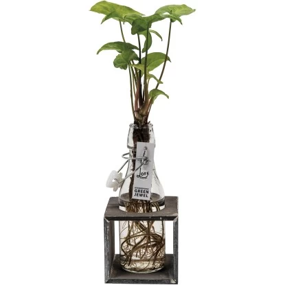 Hydroponik ist eine Form von Hydrokultur, bei der Pflanzen ihre Wurzeln im Wasser bilden und ganz ohne Erde wachsen und gedeihen. Diese Art der Pflanzenhaltung ist denkbar einfach und ein neuer Trend. Die Flaschen sind aus hellem Glas und lassen die natürliche Schönheit der Pflanzenwurzel gut zur Geltung kommen. Der Rahmen aus Holz sieht nicht nur gut aus, sondern verleiht dem Arrangement auch Standsicherheit. Wer den Trend „Botanisches Wohnen“ mag, der wird an diesem modernen Arrangement mit Sicherheit viel Freude haben.