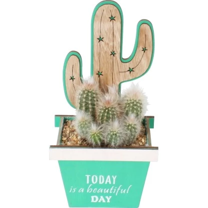Das Holz-Gefäß mit Kaktus-Silhouette und Aufdruck, in dem ein Kaktus zusammen mit Deko-Steinchen sitzt, ist wirklich originell im Design und verbreitet gute Laune.