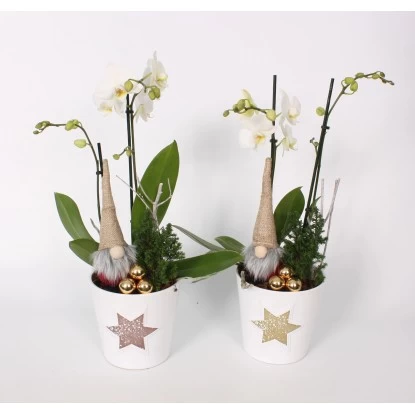 Das dekorative Arrangement besteht aus einer weißen Schmetterlingsorchidee (Phalaenopsis) im Keramik-Gefäß, das mit einem wahlweise goldenen oder silbernen Stern bedruck ist. Eine kleine Scheinzypresse (Chamaecyparis) begleitet die Orchidee als grünes Beiwerk, ein niedlicher Wichtel und einige kleine Kugeln vervollständigen das Ganze.