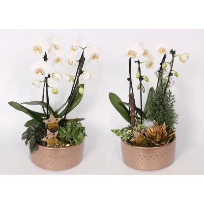 Das moderne Arrangement besteht aus einer weißen Schmetterlingsorchidee (Phalaenopsis) im bronzefarbenen Keramik-Gefäß, das mit goldenen Stern-Einsteckern und Granulat dekoriert ist. Dadurch entsteht ein schöner Metallic-Look. Verschiedene Grünpflanzen begleiten die Orchidee als grünes Beiwerk.