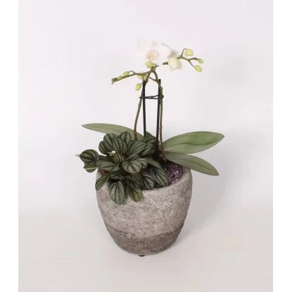 Dieses Orchideen-Arrangement ist modern und elegant zugleich. Es ist mit einer zweitriebigen, weiß blühenden Schmetterlingsorchidee (Phalaenopsis) und einem Zwergpfeffer (Peperomia) bepflanzt.