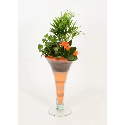 Dieses anmutige Arrangement besticht durch die außergewöhnliche Form des Glases und dem dekorativen Sand und eignet sich hervorragend als Tischdekoration oder als Blickfang auf dem Sideboard. Kombiniert sind Flammendes Käthchen (Kalanchoe bossfeldiana), Bergpalme (Chamaedorea) und Efeu (Hedera), alles pflegeleichte Pflanzen. Es ist ein dekoratives Ensemble aus unterschiedlichen Pflanzen, die zusammen ein harmonisches Bild ergeben.