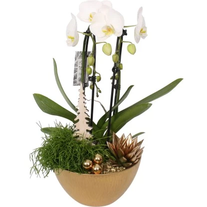 Mit diesem Orchideen-Arrangement setzen Sie dekorative Akzente in der Weihnachtszeit und schaffen eine stimmungsvolle Atmosphäre. Begleitet wird diese weiß blühende Schmetterlingsorchidee (Phalaenopsis) von verschiedenen Blattpflanzen, die einen grünen Rahmen bilden.